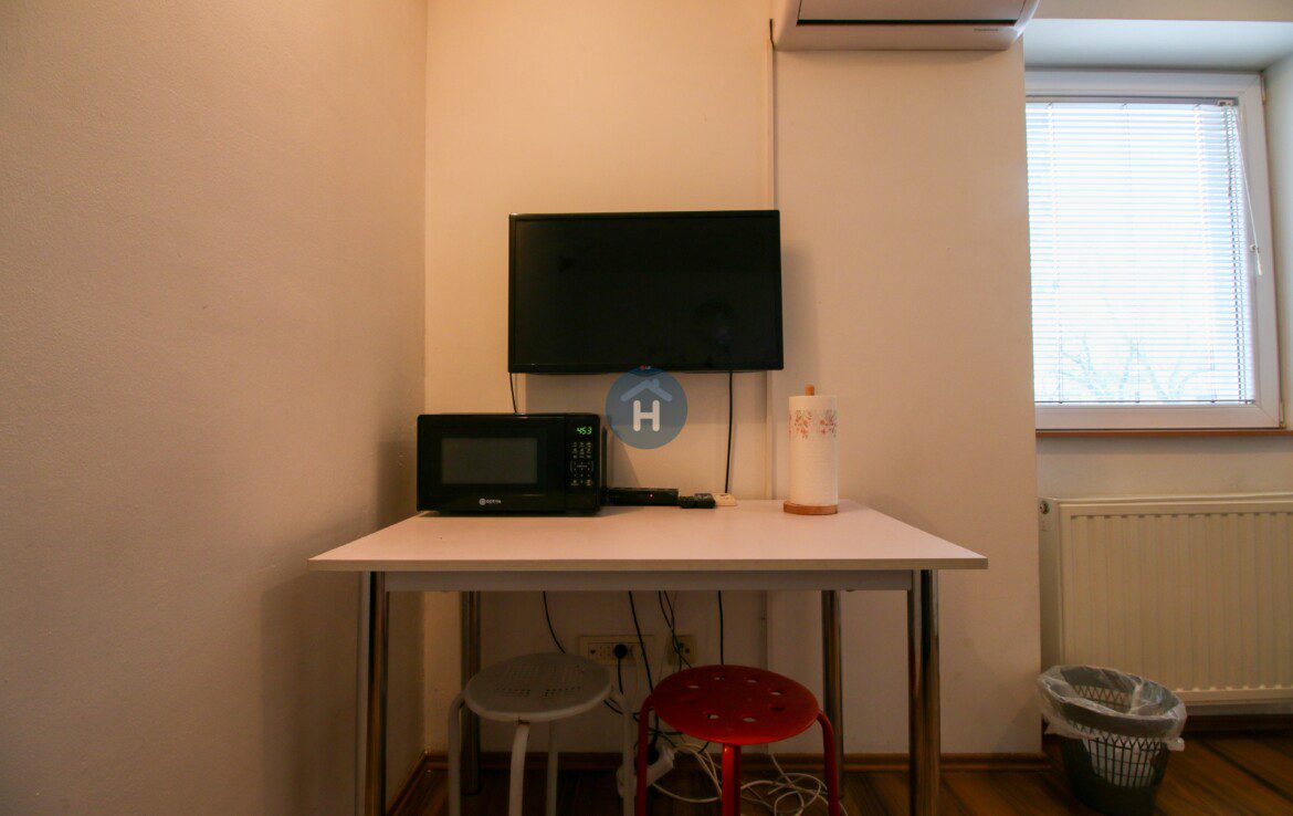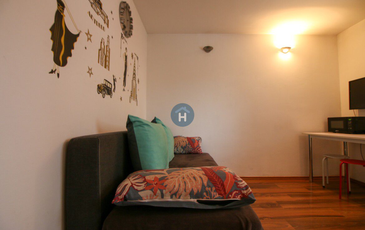 The apartment is on the first floor of a house with no elevator. It consists of one bedroom and one bathroom. The bedroom includes a bed and a closet, while the desk and chair are located in the living room. The apartment comes with bed linen and towels. All additional amenities are listed under the facilities section.