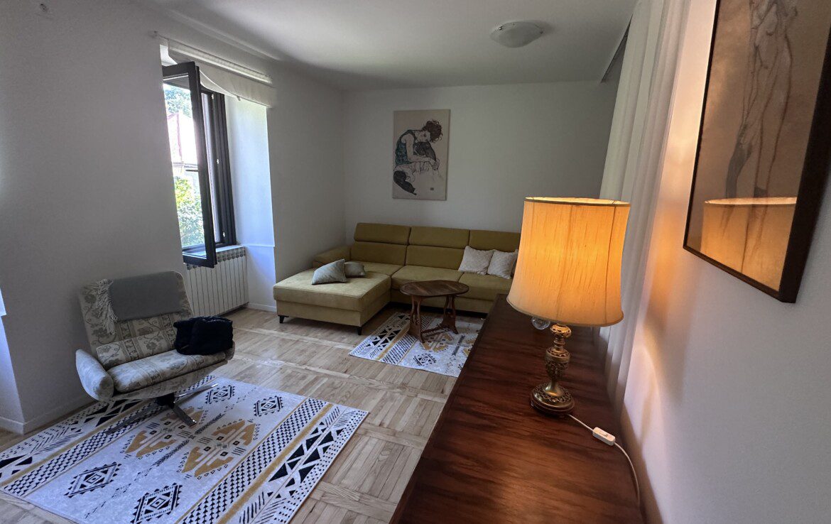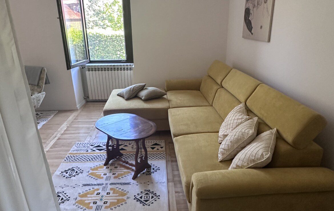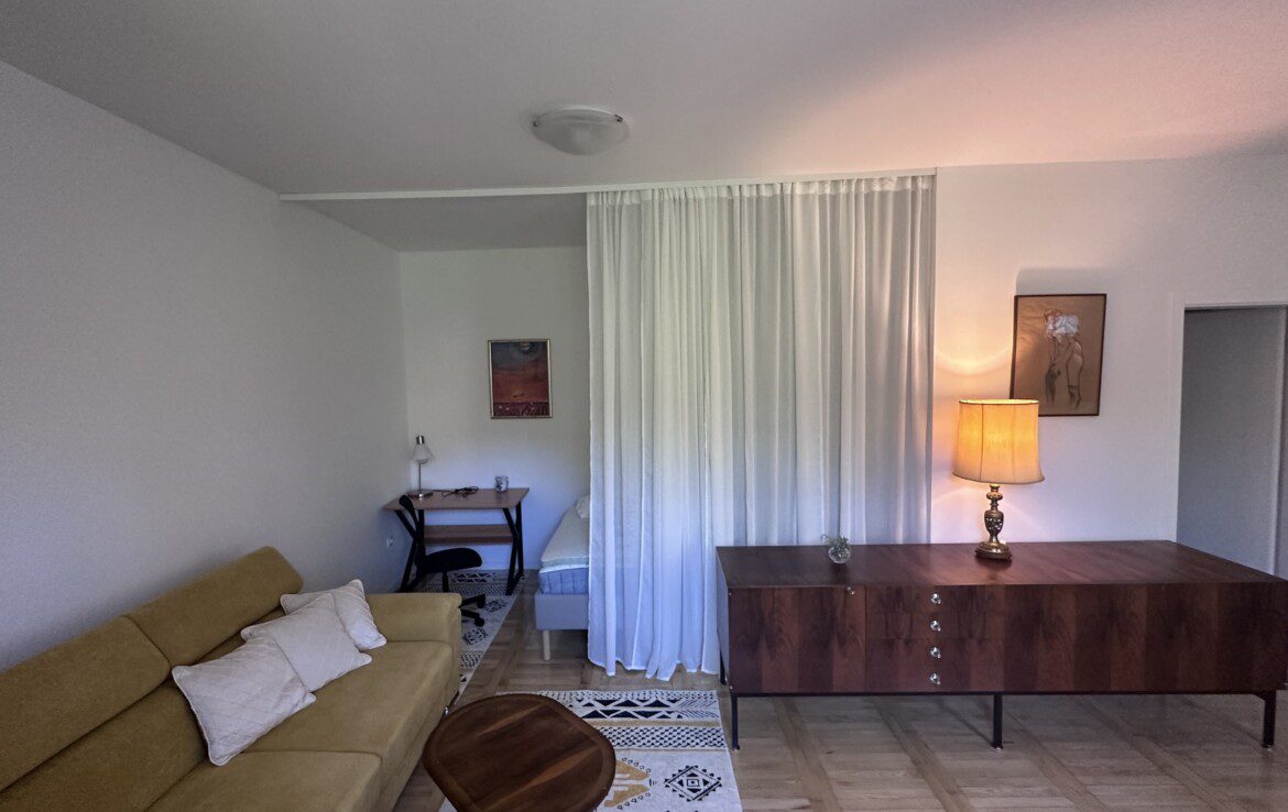 Spacious studio apartment located in the wider city center, in a residential and calm area with lots of green. The studio apartment consists of a large room which can be used as living/sleeping area, the sofa in the room is quite big and can be used for sleeping, a mattress topper can be provided if necessary. The door which is access from the living room will be used as a built in wardrobe so the this whole smaller room will be used for this purpose.