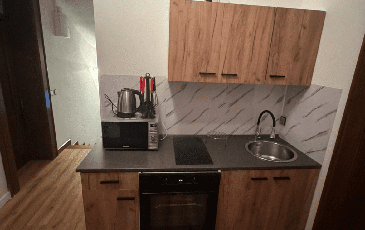 A small, newly added kitchen will be installed in the hallway, equipped with everything needed for daily cooking – an electric hob, oven, kettle, toaster, and a microwave. The apartment also includes essential amenities such as WiFi, TV, heating, and a washing machine. The property is pet-friendly, as the owners have dogs living on-site.