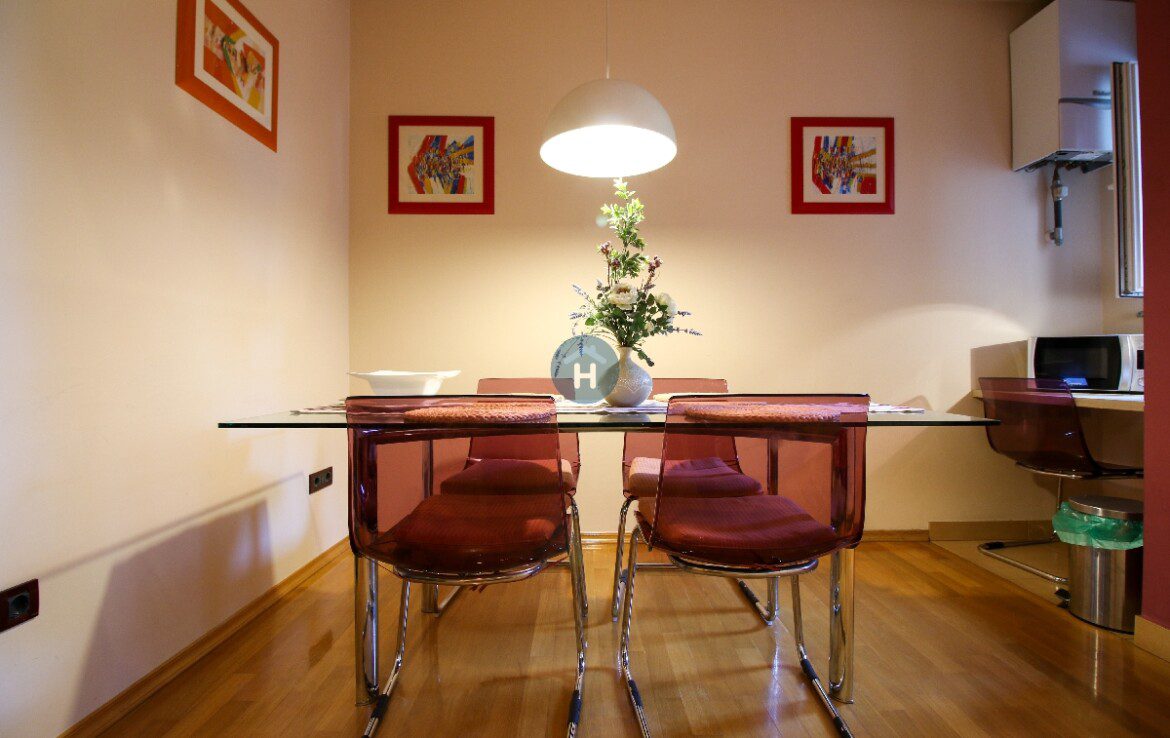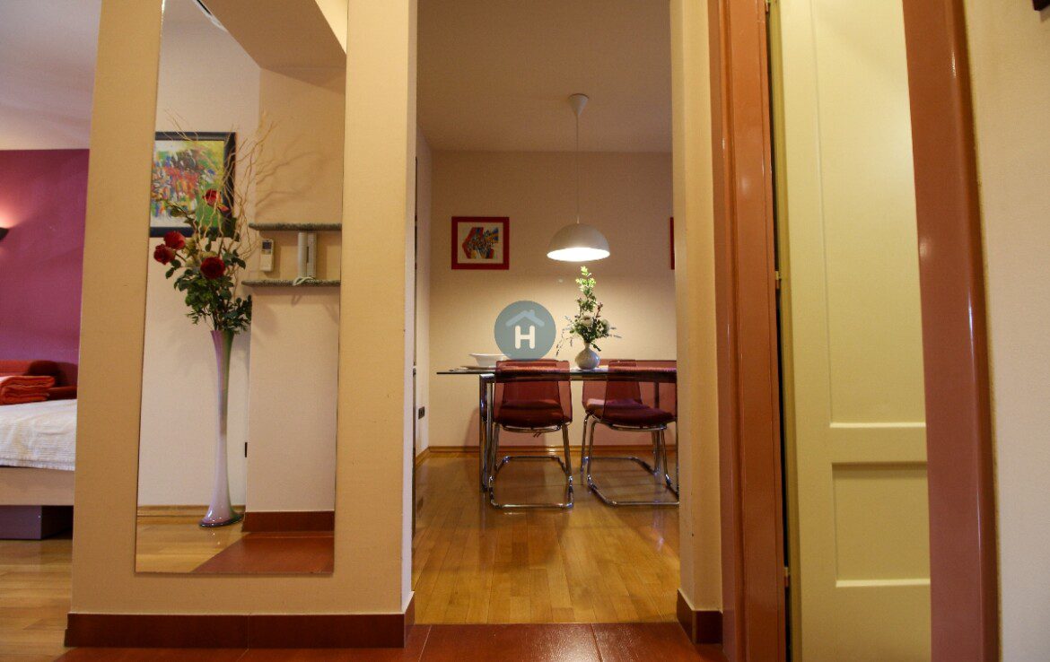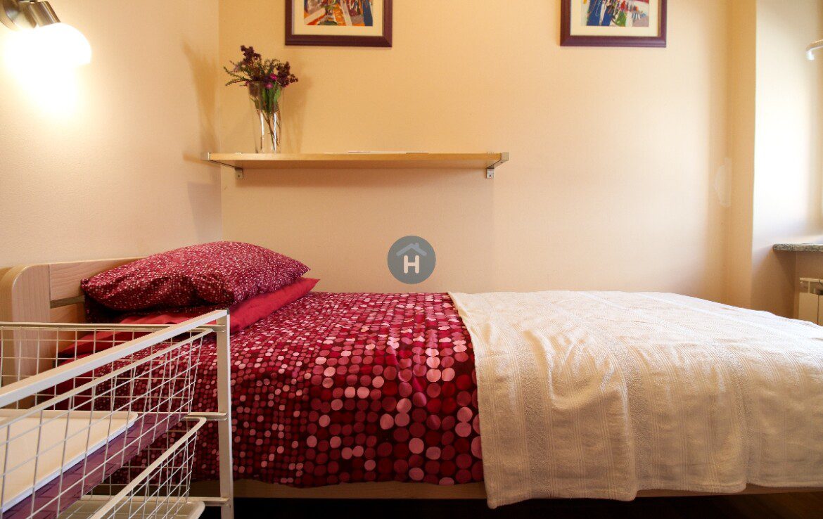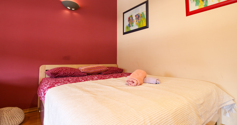 The living room has a great atmosphere because of the larger wall’s red wine color, the wooden floor, and its elegant decoration. This room has a two-person sofa, a coffee table, a television, heating, a closet with mirrored doors. It can be used as a bedroom because there is a double bed. Furthermore, there is a guest room with a single bed, heating, and a window.