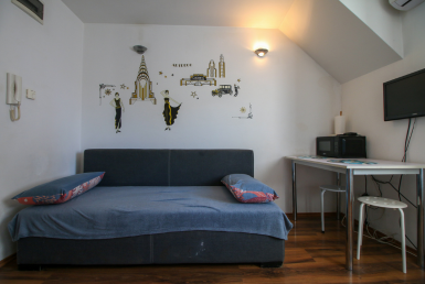 Room Ravnice Two – 5B offers a comfortable and private living space, perfect for both short and long stays. The room is equipped with air conditioning, bed sheets and linen, a fridge, heating, and a secure bedroom lock.